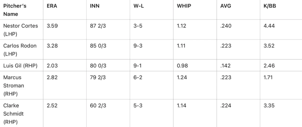 Out of the five starting pitchers with more than 10 appearances this season, three have an ERA below 3.00 (Luis Gil, Marcus Stroman, Clarke Schmidt), and the other two (Nestor Cortes, Carlos Rodon) have managed to keep their ERA below 4.00, showing great stability in the starting rotation.