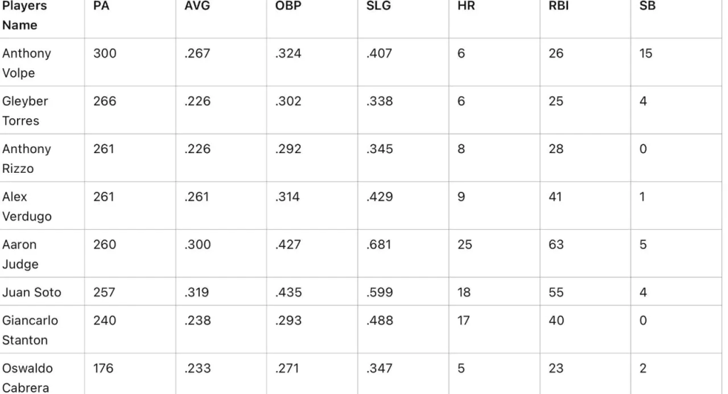 Below are the offensive stats for the Yankees’ main hitters (at least 150 at-bats):