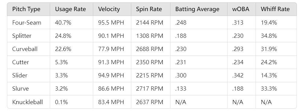 Yamamoto has a diverse repertoire of pitches, using his four-seam fastball (40.7%) most frequently, along with a splitter (24.8%) and curveball (22.6%). He also employs a cutter (5.3%), slider (3.3%), and a rare slurve (0.1%), making “pitch diversity" one of his major strengths.