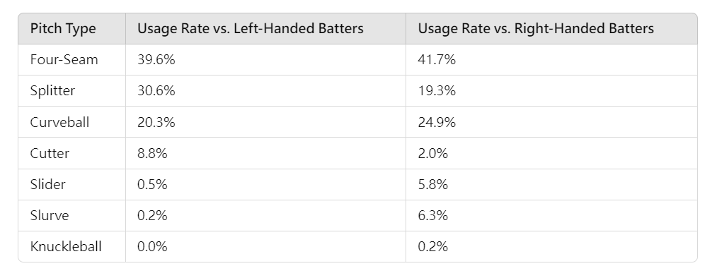 When facing right-handed batters, on the other hand, he mainly uses the curveball (24.9%) along with the fastball, though the splitter is also used significantly (19.3%). It is noteworthy that his pitch mix against right-handers is more diverse, with a more balanced distribution of his main pitches.