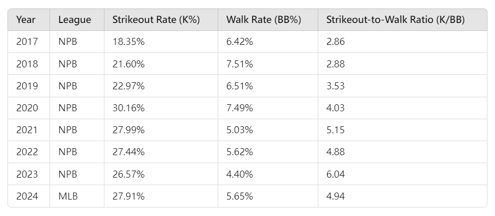 Since 2018, Yoshinobu Yamamoto’s first full professional season, his annual strikeout rate (K%) has consistently been above 20.00%, and since 2020, his strikeout-to-walk ratio (K/BB) has been above 4.00 every year. Notably, in the 2023 season, Yamamoto’s K/BB ratio reached 6.04, the best of his career, which played a significant role in the Dodgers deciding to sign him to a substantial contract.