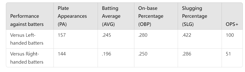 This season, Yuki Matsui has shown excellent control when facing left-handed hitters, with an overall batting average against him below .200 and effective suppression of extra-base hits. However, his performance against right-handed hitters, while not poor compared to the league, isn’t as dominant as against left-handers.