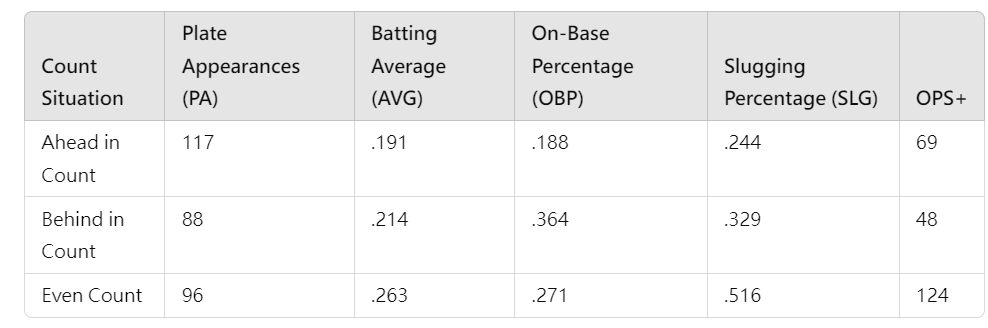 - Performance in Even Counts: He tends to struggle when the count is even, showing a stark contrast to his effectiveness when ahead or behind in the count.