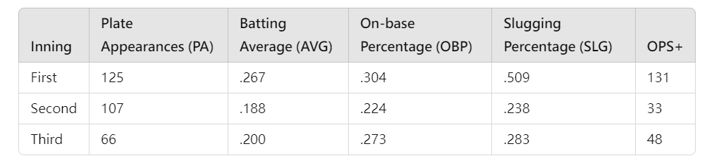 - Struggles in Early Innings: Yamamoto tends to be more vulnerable in the early innings, particularly the first, where his OPS against hitters is notably high (OPS+ 149) and his ERA in the first inning stands at 5.14.