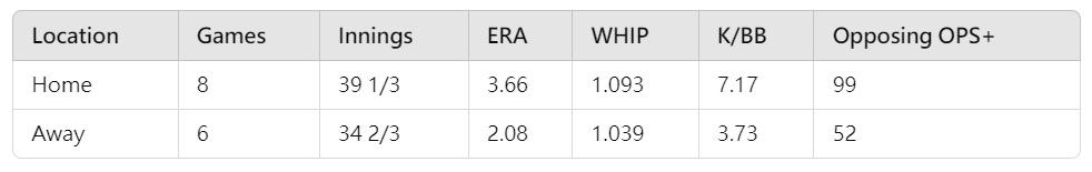 While Yamamoto’s overall statistics for away games may not seem ideal, this is largely due to his first game at Gocheok Dome in Seoul against the San Diego Padres, where he surrendered five runs in just one inning. Excluding this game, his ERA at Dodger Stadium is only 2.58, and his control (K/BB of 8.20) has been excellent.
