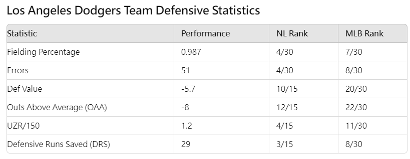 This season, the Dodgers have controlled errors quite well defensively, making only 51 defensive mistakes in 107 games (an average of 0.48 errors per game), ranking 4th in the National League. However, in many advanced defensive metrics (except for range performance), the Dodgers’ overall performance isn’t very good. It’s worth noting that the Dodgers have saved a considerable number of runs compared to the league average this season due to their excellent defensive range.