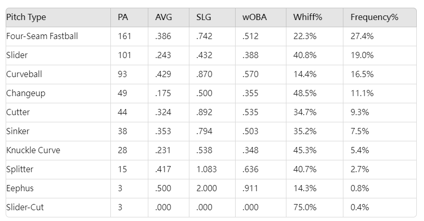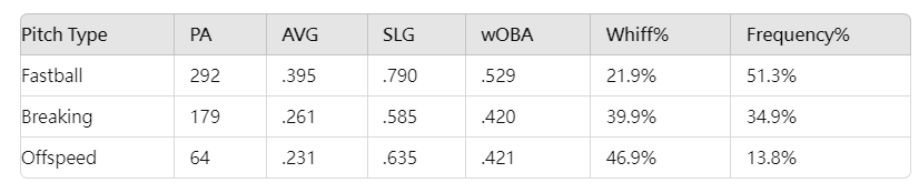 As for breaking balls, Judge has a whiff rate exceeding 40.0% against both sliders and curveballs (two common breaking ball pitches) this season. Despite the higher whiff rate, when he does make contact with these pitches, he often produces solid extra-base hits.