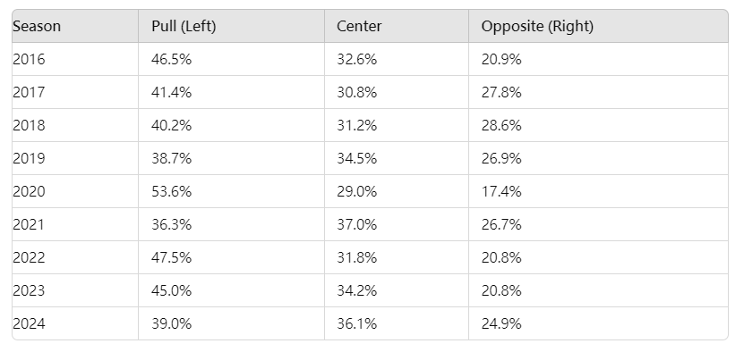 Aaron Judge is a well-rounded hitter when it comes to hitting direction. Particularly over the past four years (2021-2024), he has directed over 30.0% of his hits toward the center of the field, with this season seeing that number reach as high as 36.1%. Although his overall performance across the nine seasons (2016-2024) shows that he primarily pulls the ball (with several seasons where his pull percentage exceeded 45.0%), his ability to hit in the opposite direction is also quite significant, with an average of 24.8% across his nine seasons.