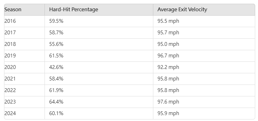 Aaron Judge is a hitter who consistently makes strong contact with the ball. Especially in the past three years (2022-2024), his hard-hit ball percentage has exceeded 60.0%, and his average exit velocity has been over 95.0 mph. During these three years, Judge has consistently hit the ball solidly, resulting in an OPS+ over 170 each year (210 in 2022, 174 in 2023, and 221 in 2024).