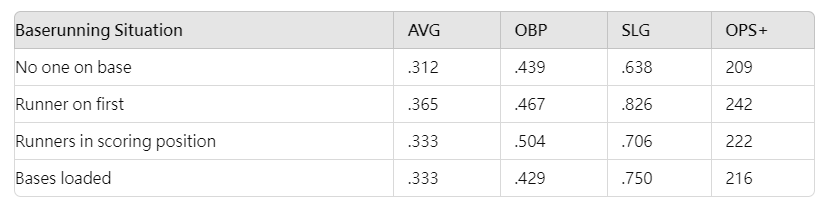 This demonstrates that Judge’s performance is not significantly affected by different base-running situations, resulting in very stable offensive numbers across all scenarios this season.