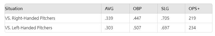 This season, Aaron Judge has shown exceptional performance against both right-handed and left-handed pitchers, with an OPS+ exceeding 200 in both cases (219 against right-handers and 234 against left-handers). Notably, Judge’s batting average against right-handed pitchers is .339, which is .036 higher than his .303 average against left-handers.
