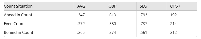 Overall, Aaron Judge is a hitter who does not shy away from being behind in the count. Although his performance in terms of batting average, on-base percentage, and slugging percentage declines when he is behind in the count compared to when he is ahead, his OPS+ when behind in the count is actually higher than when he is ahead, relative to league standards (with data starting from 1988).