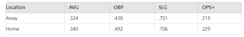 This season, Aaron Judge has demonstrated outstanding batting performance both at home and on the road. Not only did his batting average exceed .320 in both settings, but his tremendous hitting power also led to a slugging percentage of over .700 in both home and away games.