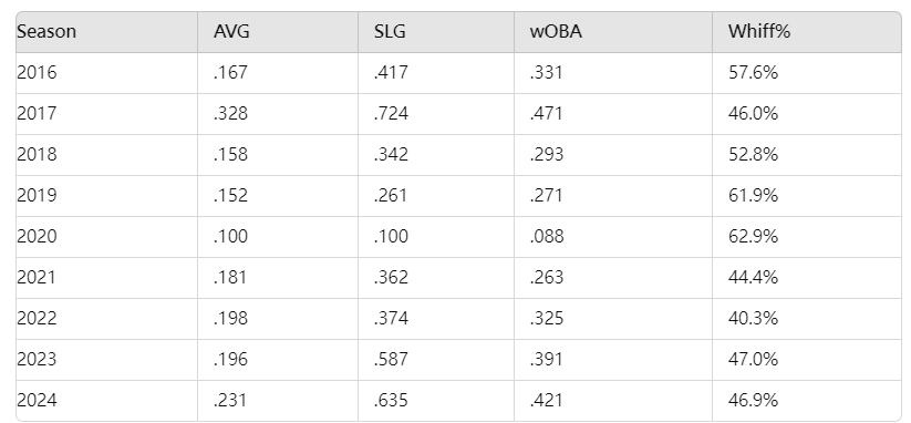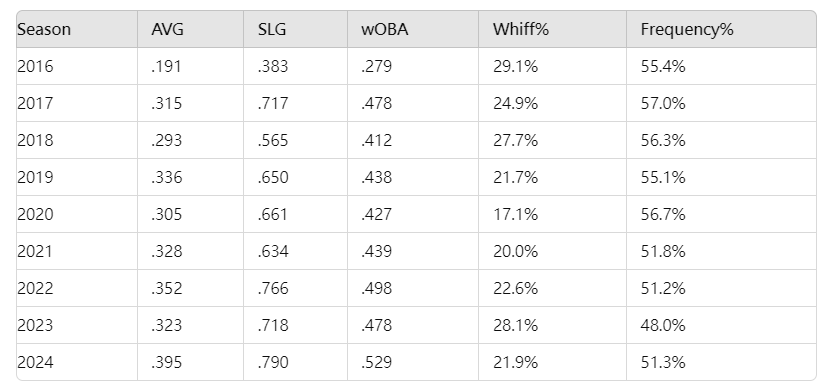 In recent years, Aaron Judge has performed quite well against breaking pitches, especially in the past four seasons (2021-2024), where in three of those seasons, his overall batting average exceeded .250, and he showed excellent power as well. Although last year (2023) Judge’s overall performance against breaking pitches was not ideal, he quickly adjusted this year, improving both his batting average and slugging percentage while also reducing his whiff rate. This successful adjustment has made his batting performance this season more impressive compared to last season.