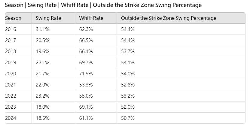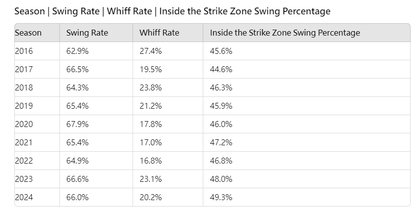 Below are the statistics from Aaron Judge’s nine-season career, detailing his swings at pitches inside and outside the strike zone, as well as whether or not he made contact.