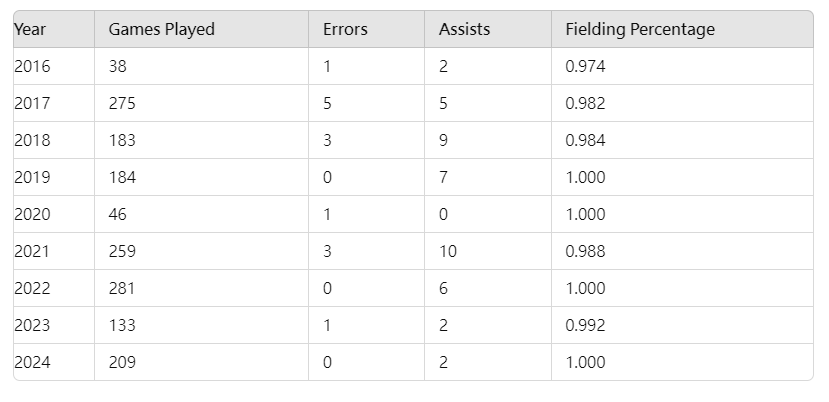 Overall, Aaron Judge’s defensive performance has been quite stable. In his career, covering 1608 outfield defense appearances, he has made only 13 errors, achieving a fielding percentage of 0.992. Additionally, he has made up to 44 long throw assists, demonstrating his exceptional throwing arm strength.