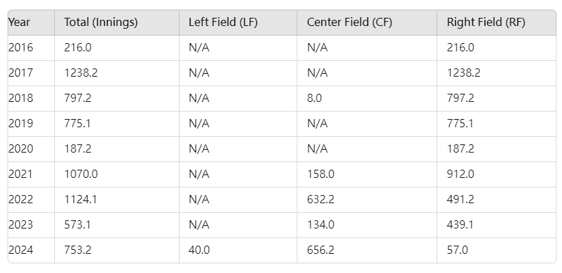 Aaron Judge is a player with remarkably stable defense, boasting a career ErrR (Error Run Saved) of 3.9, and has maintained positive values in this metric over the past 7 seasons (2018-2024). Notably, Judge has played 1589 1/3 innings in center field with an ErrR of 1.6, and 5107 1/3 innings in right field with an ErrR of 2.2.