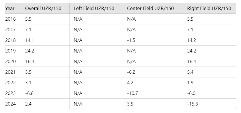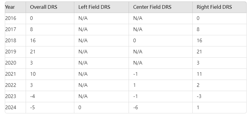 Overall, Aaron Judge is a player with a wide defensive range. In his 9-season career, only in 2023 did his UZR/150 fall below 0.0, and he even had consecutive seasons with UZR/150 values above 10.0. This year, Judge primarily defended center field, while when he played right field, the Yankees’ center field was usually manned by Trent Grisham, who has a considerable defensive range. As a result, many fly balls between center and right field are typically handled by Grisham, which is likely the main reason for Judge’s suboptimal UZR/150 performance in right field this season.