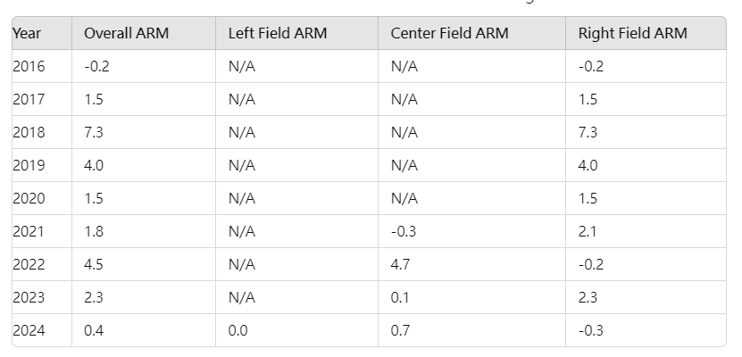 Looking at the data, Aaron Judge’s ARM value this season has slightly decreased from previous years. This is not only due to some injuries he encountered at the start of the season but also because his primary defensive position has shifted from right field to center field. Additionally, Judge’s ARM value in right field this season is below zero (-0.3), likely because his frequency of handling the ball in right field was not as high as before. This is mainly because when Trent Grisham plays as a center fielder, Judge often shifts to right field, and Grisham, who has excellent defensive capabilities in center field, handles more plays, resulting in lower accumulated ARM data.